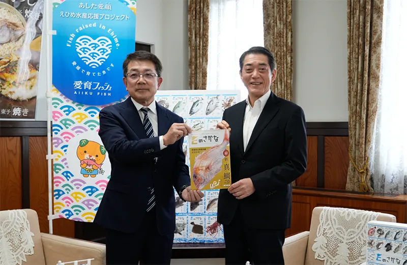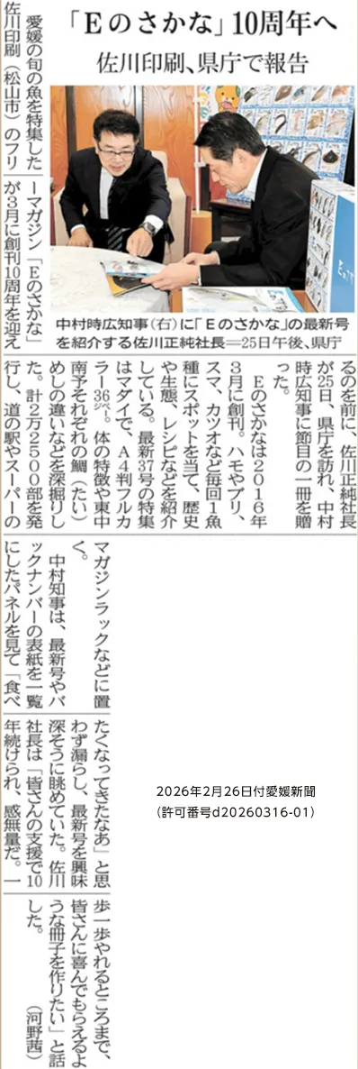 2026年2月25日、弊社代表取締役の佐川が愛媛県庁を訪れ、中村知事を表敬訪問いたしました。弊社が発行しておりますフリーペーパー「Eのさかな」が創刊10周年を迎えたことをご報告申し上げるとともに、10周年記念号となる「新・真鯛号」を贈呈いたしました。