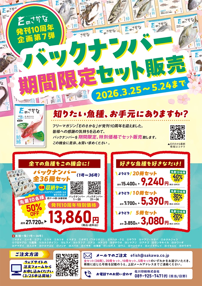 弊社が、愛媛の漁業を応援するために創刊したフリーペーパー「Eのさかな」は、おかげさまで発刊10周年を迎え、これまで35冊をお届けすることができました。これを記念し皆さまへの感謝の気持ちを込めまして、バックナンバーを期間限定・特別価格でセット販売中です。全35冊セット、好きな魚種を選べる20・10・5冊セットがございます。販売期間が残り2週間となりました。この機会にぜひお買い求めください。