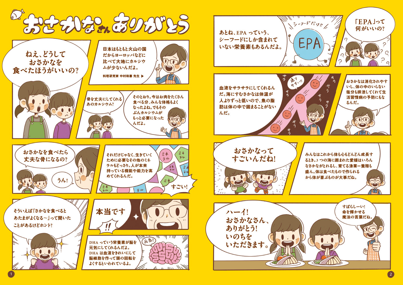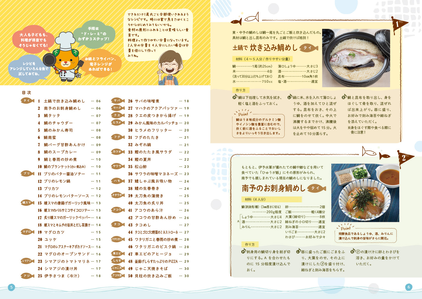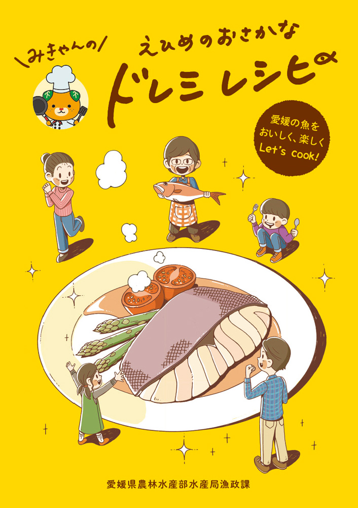 「えひめのおさかなドレミレシピ」は愛媛県の魚食普及の一貫として愛媛県内の小・中学校の全校生徒に配布。愛媛の漁業を応援するフリーペーパー「Eのさかな」で連載している「ドレミレシピ」を料理研究家中村和憲とともに20代30代の家庭をターゲットに再編集しました。お母さんが台所においておきたくなるように表紙にイラストで本の趣旨を表し、小さい子供が魚が体にいいことを漫画で理解できるものとしました。