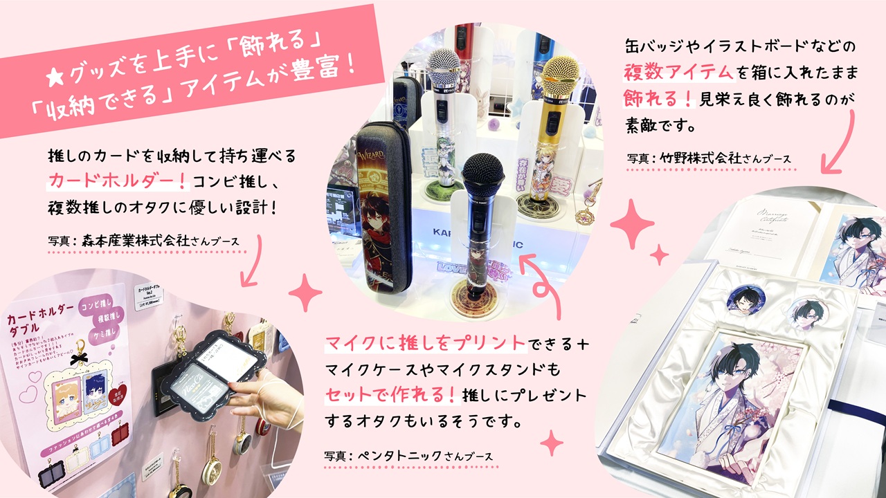 たくさん買ったグッズをどう飾るか、収納するか……というのは推し活をしたことがある人ならぶち当たる壁です。その課題を解決してくれそうなアイテムがたくさんありました。