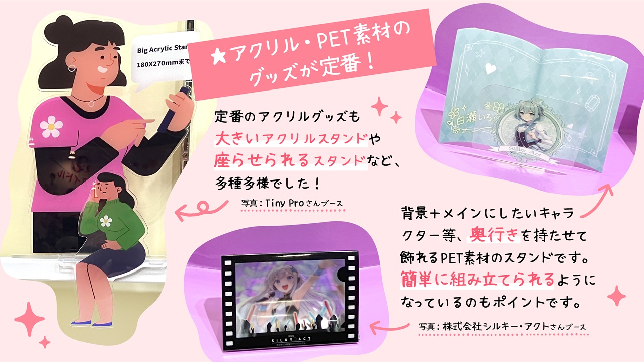 世の中にあふれるグッズの中でも、とりわけアクリルとPET素材は種類が多かった印象です。定番のアクリルスタンドは多種多様ですし、PET素材のカードやスタンドにも工夫が見られました。