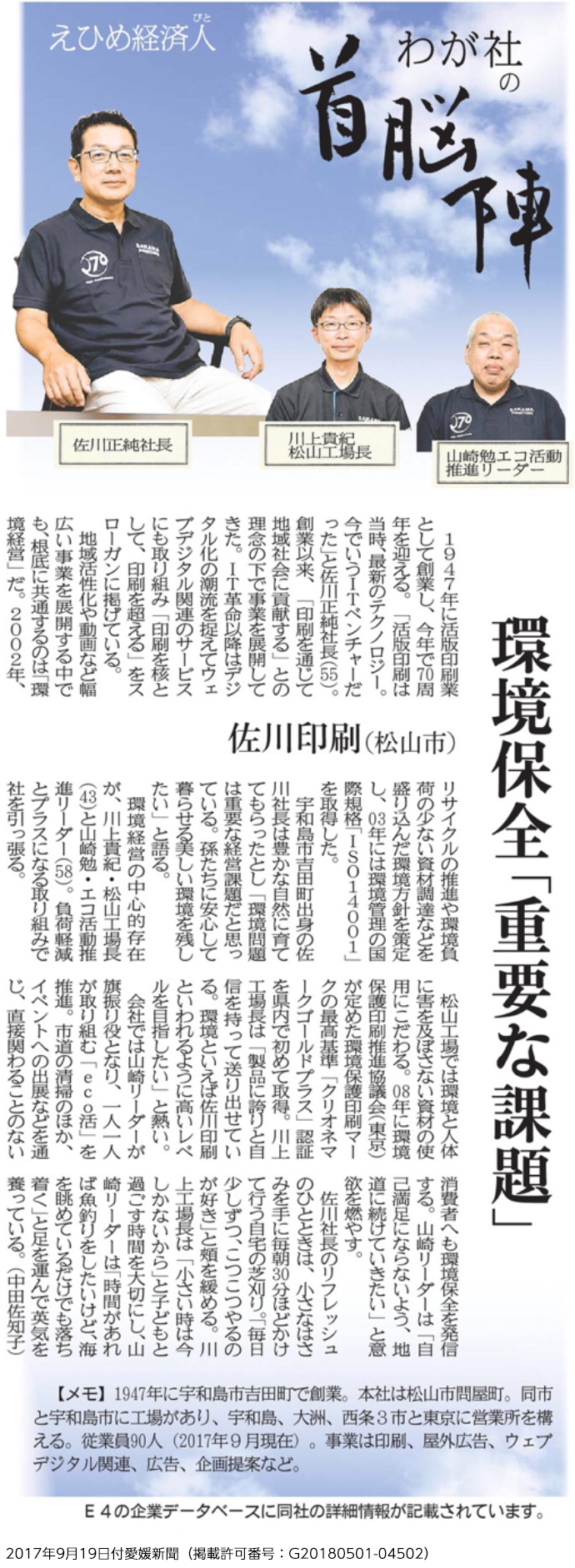 9月19日付の愛媛新聞朝刊「えひめ経済人 わが社の首脳陣」に、 弊社の記事を掲載していただきました。