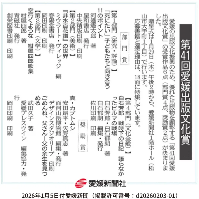 愛媛の出版文化振興のため、優れた出版物を顕彰する「第41回愛媛出版文化賞」にて、