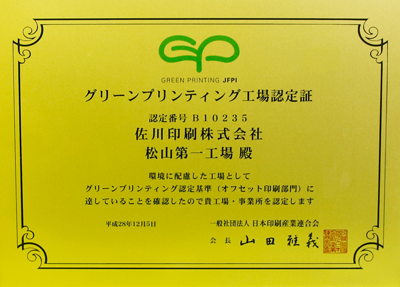 オフセット印刷部門のグリーンプリンティング工場として認定を受けました。